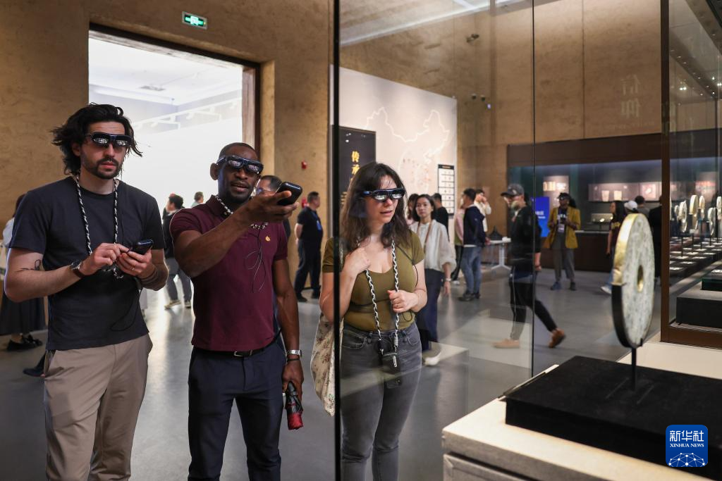 4月23日,参加第三届联合国教科文组织国际博物馆高级别论坛的嘉宾使用AR(增强现实)眼镜观看良渚博物院展品。