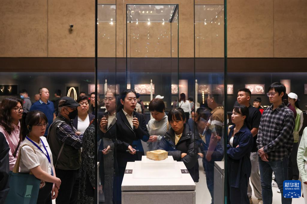 4月23日,游客在讲解员的带领下参观良渚博物院。