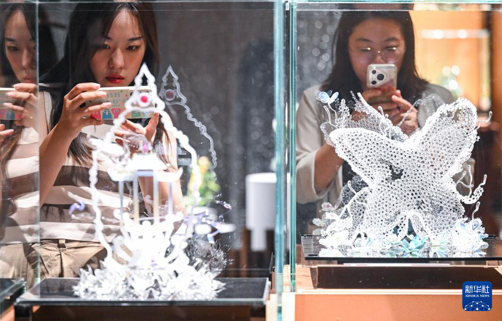 6月10日,参观者在拍摄一件名为“暖光里的葵语”的参展琉璃作品。