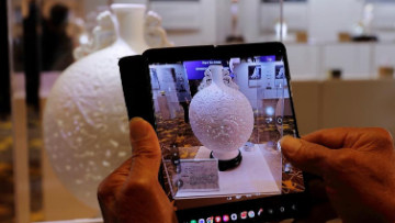 11月26日,在匈牙利布达佩斯美术馆,一名参观者拍摄“秦汉文明展览”展品。