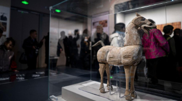 1月7日,观众在中国美术馆观看展出的阴山岩画展品。