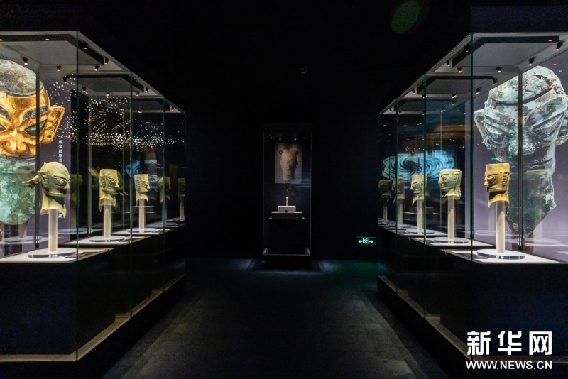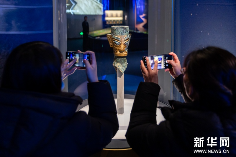 展品包括金辉璀璨的太阳神鸟金饰,双目如棱的戴金面罩青铜人头像,玄奇诡谲的戴冠纵目面具,以及青铜立人像、龙柱形青铜器、肩扛象牙人形纹玉璋等,这些先民的杰作,共同勾勒出一个瑰丽精彩的古蜀社会,也彰显了中华文明和而不同的宏大气象。