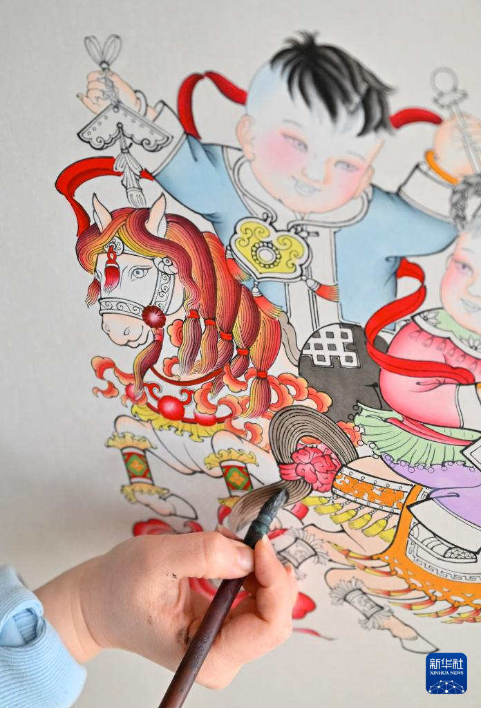2月4日,在天津杨柳青画社,画师绘制年画《马到成功》。