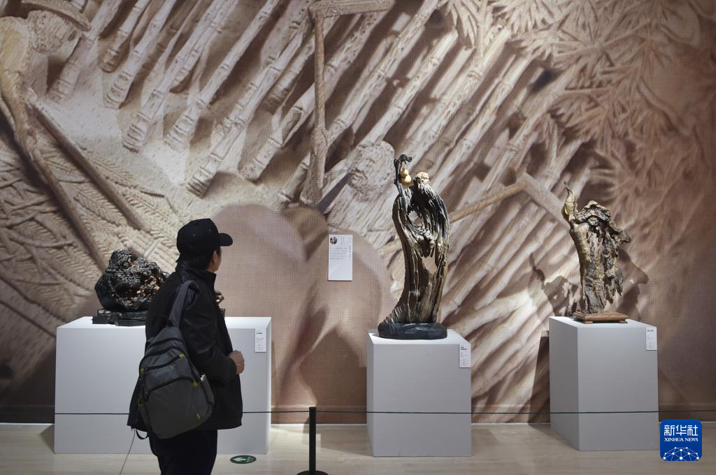 3月23日,参观者在中国美术馆观看展出的木雕展品。