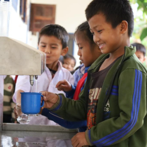 3月11日,在老挝琅勃拉邦省哈克村,学生通过净水设备接取饮用水。新华社记者 马淮钊 摄