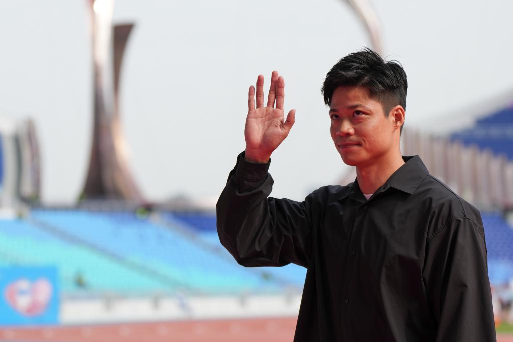 12月12日,苏炳添在田径赛场向观众致意。新华社记者 刘梦琪 摄