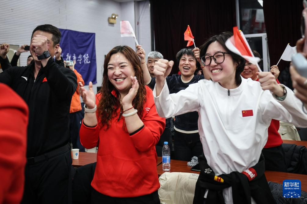 2月18日,沈阳体育学院教师庆祝徐梦桃夺冠。