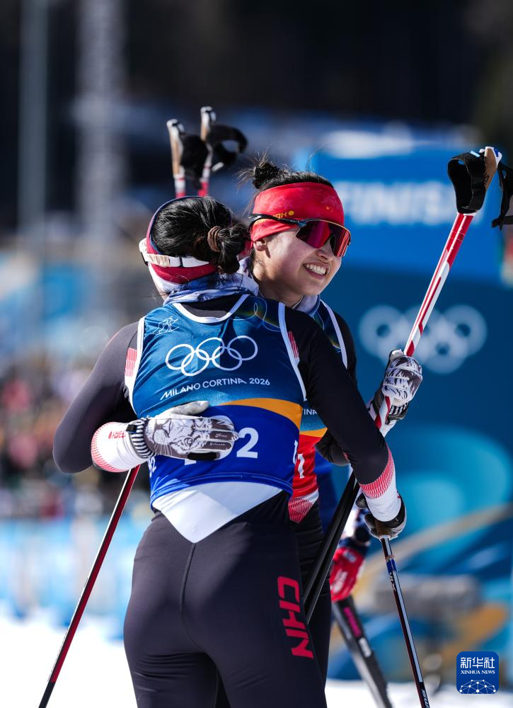 2月18日,中国队选手迪妮格尔·衣拉木江(后)、池春雪在冲线后相拥。