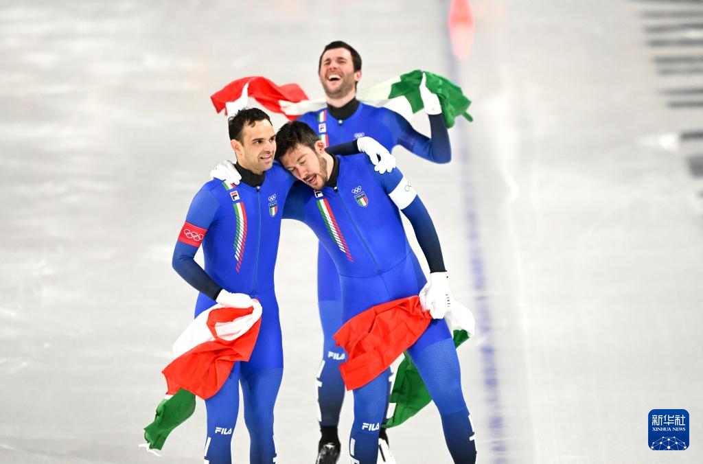 2月17日,意大利队选手安德烈亚·焦万尼尼、达维德·吉奥托、米凯莱·马尔法蒂(从左至右)在赛后庆祝。他们获得冠军。
