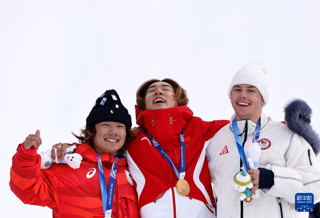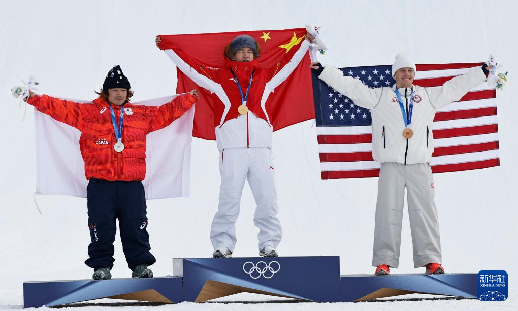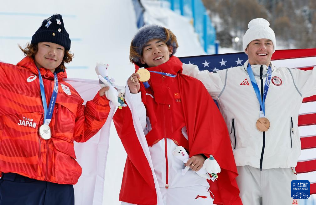 2月18日,冠军中国选手苏翊鸣(中)、亚军日本选手长谷川帝胜(左)和季军美国选手坎特在颁奖仪式上。