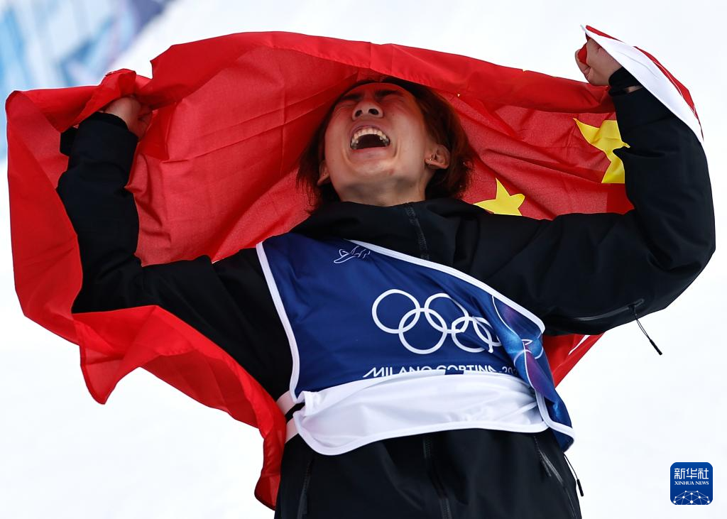 2月18日,中国选手苏翊鸣在比赛后庆祝夺冠。