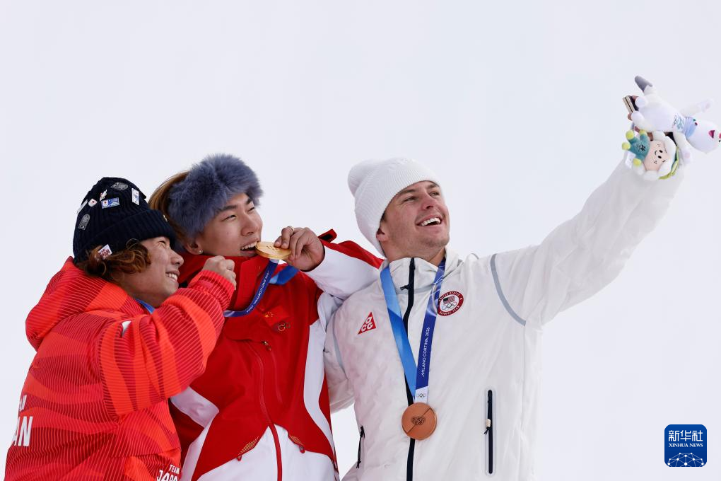 2月18日,冠军中国选手苏翊鸣(中)、亚军日本选手长谷川帝胜(左)和季军美国选手坎特在颁奖仪式上自拍留影。