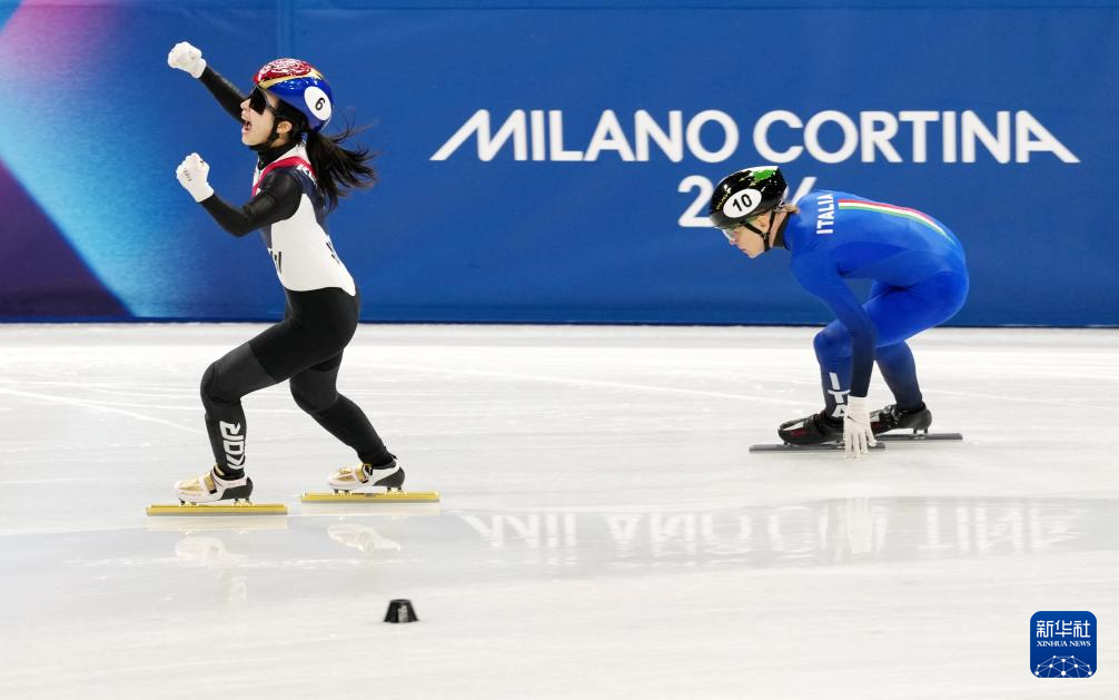 2月18日,韩国队选手金吉莉(右)率先撞线后庆祝。