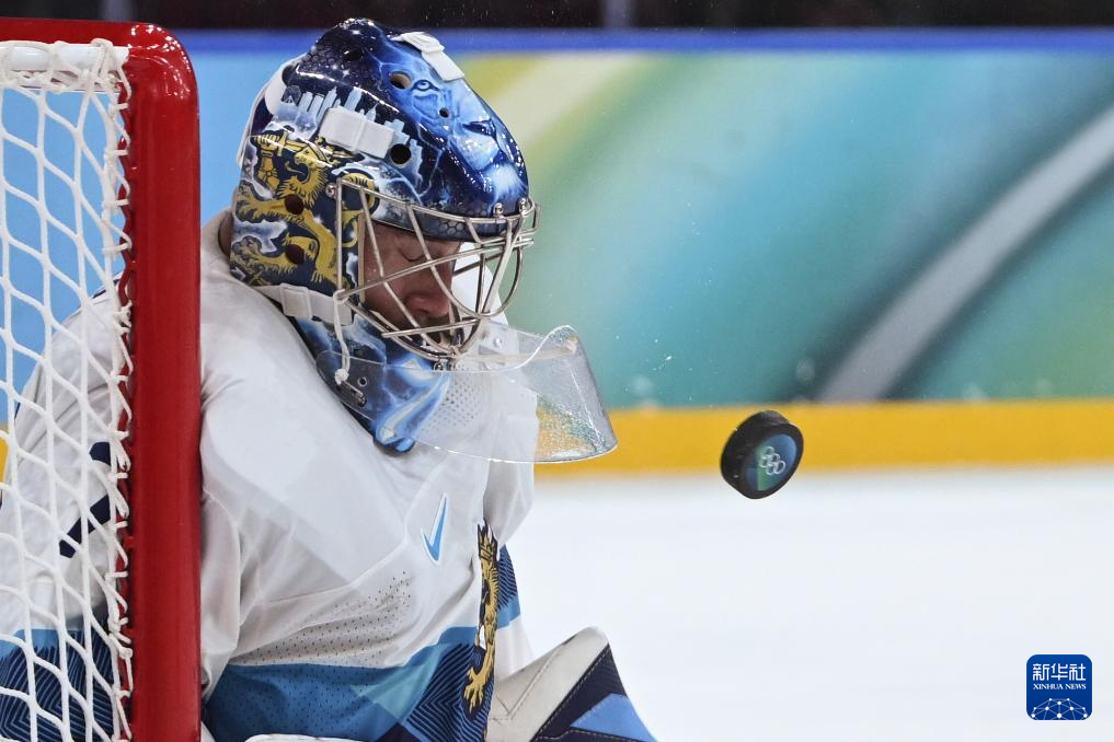 2月20日,芬兰队门将萨罗斯(右)在比赛中扑救。