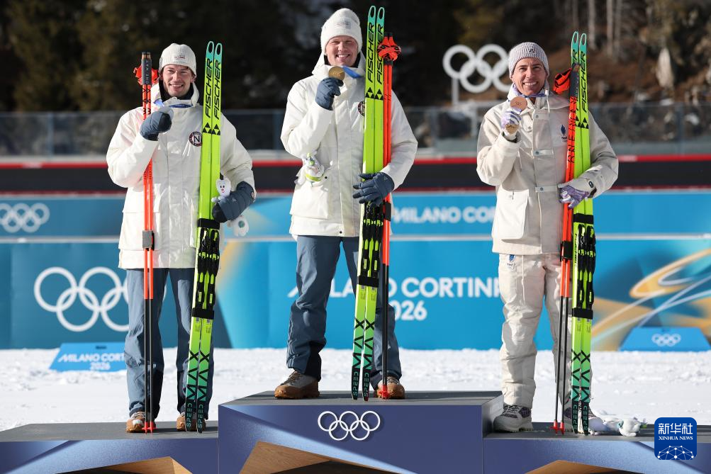 2月20日,亚军挪威选手斯图拉·霍尔姆·莱格雷德、冠军挪威选手约翰内斯·戴尔、季军法国选手康坦·菲永·马耶(从左至右)在终点庆祝。