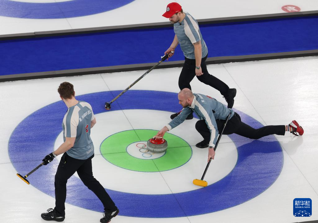 2月20日,挪威队选手芒努斯·拉姆斯菲尔(中)在比赛中掷壶。