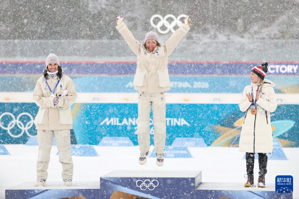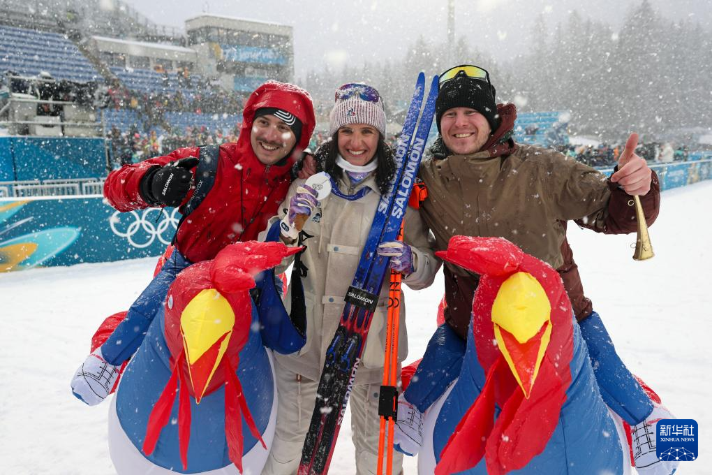 2月21日,冠军法国选手米舍隆(中)、亚军法国选手西蒙(中)和季军捷克选手沃博尔尼科娃在颁奖仪式上自拍。