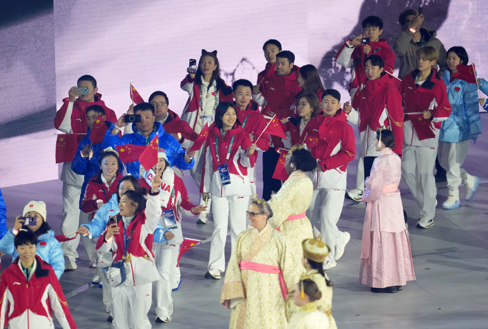 ↑中国速度滑冰运动员殷琦(右)在闭幕式入场。