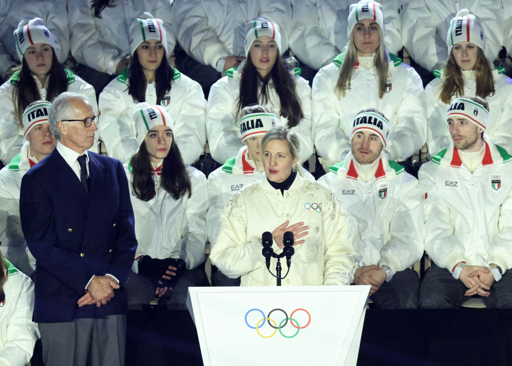 ↑意大利国旗与国际奥委会会旗在闭幕式现场升起。