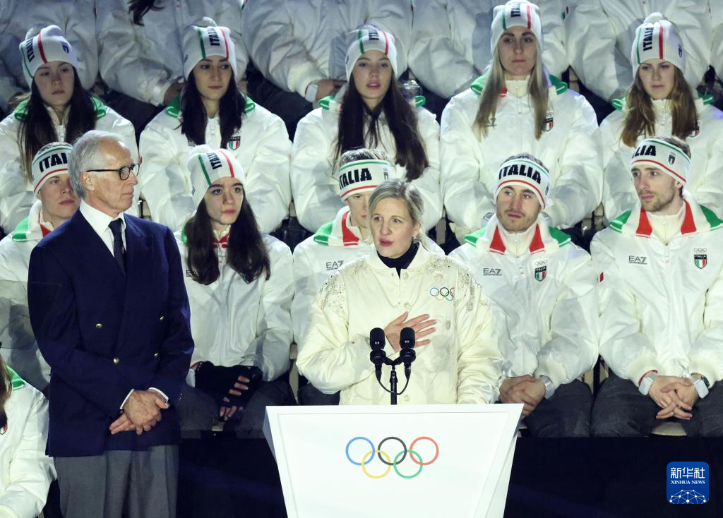 2月22日,米兰-科尔蒂纳冬奥会组委会主席乔瓦尼·马拉戈(前左)在闭幕式上发言。