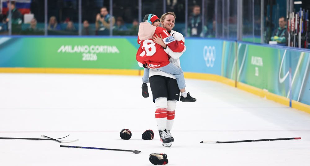 2月19日,瑞士队球员拉拉·斯塔尔德在女子冰球铜牌赛后庆祝胜利。新华社记者 王楷焱 摄