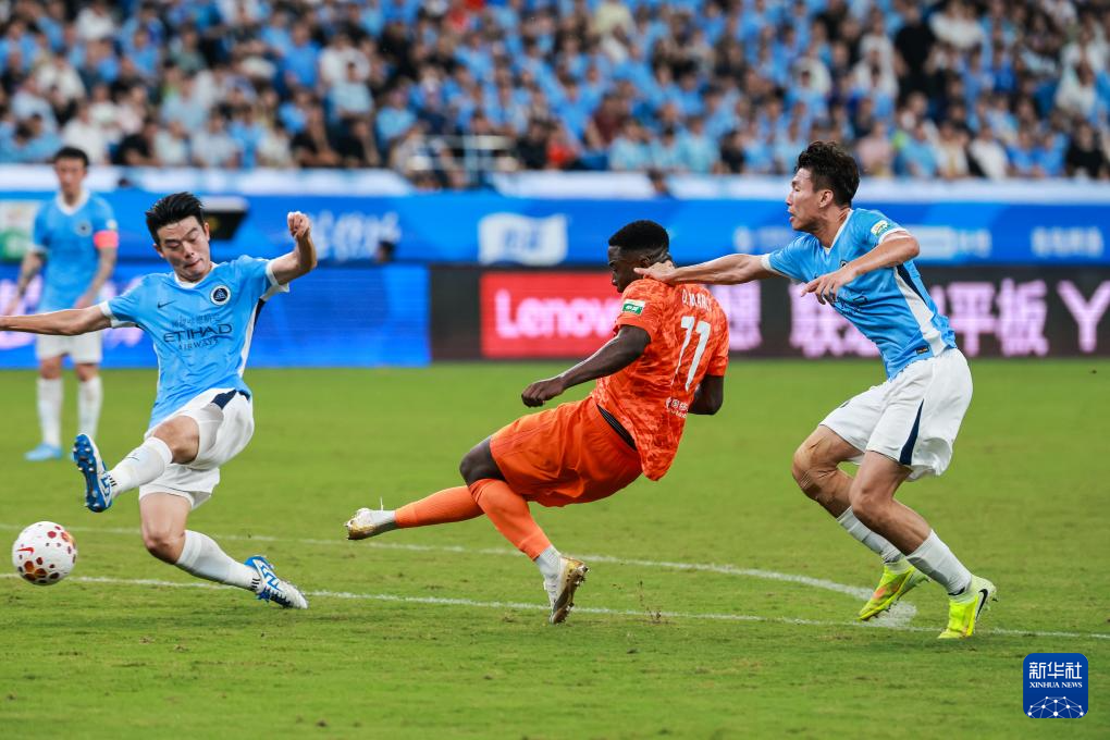 4月12日,深圳新鹏城队球员卡尔采夫(中)在比赛中射门。