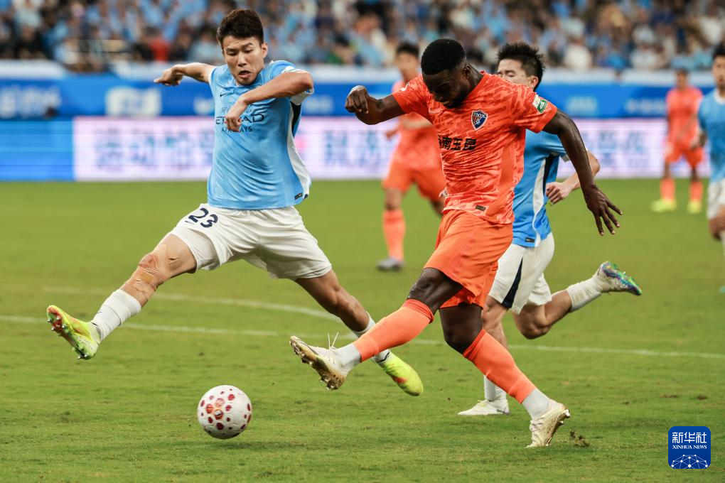 4月12日,深圳新鹏城队球员韦斯利(左一)在比赛中罚进点球。