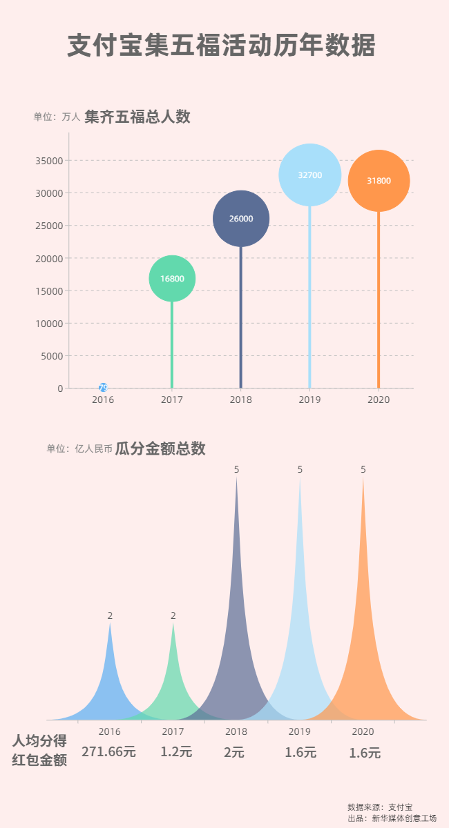 自2016年支付寶推出“集五?!钡幕顒又两褚延形鍌€年頭。從最開始只有幾十萬用戶參與,到如今幾億人共同狂歡。支付寶數(shù)據(jù)顯示,截至2月11日零點(diǎn),支付寶集五?;顒庸矊懴陆?.7億個福字,共2.6億網(wǎng)友在線上手寫了福字,送給親朋好友,其中還有350萬福字通過支付寶打印、寄送回家。今年參與紅包拜年的用戶上漲了近270%,“紅包”相關(guān)搜索量也隨之大漲538%。
