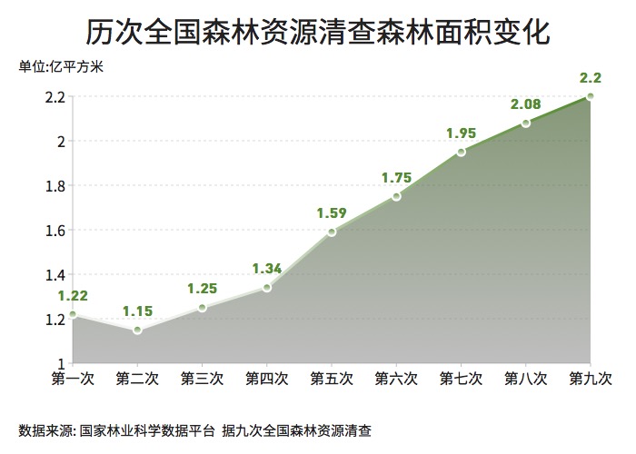 ??? 根據(jù)國(guó)家林業(yè)和草原局統(tǒng)計(jì),目前全國(guó)森林面積達(dá)到2.2億公頃,森林覆蓋率23.04%?;赝糯稳珖?guó)森林資源清查結(jié)果可以看出,我國(guó)的森林覆蓋率逐年穩(wěn)步提高。還有一些監(jiān)測(cè)數(shù)據(jù)顯示,近20年來(lái)中國(guó)新增植被覆蓋面積約占全球新增總量的25%,居全球首位。