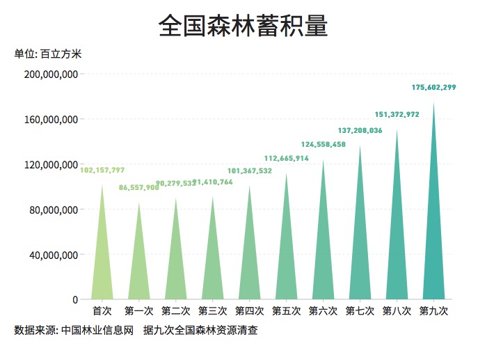 ??? 森林蓄積量是反映一個(gè)國(guó)家或地區(qū)森林資源總規(guī)模和水平的基本指標(biāo)之一,也是反映森林資源的豐富程度、衡量森林生態(tài)環(huán)境優(yōu)劣的重要依據(jù)?!笆濉逼陂g,我國(guó)森林蓄積量超過(guò)175.6億立方米,森林植被碳儲(chǔ)量91.86億噸。