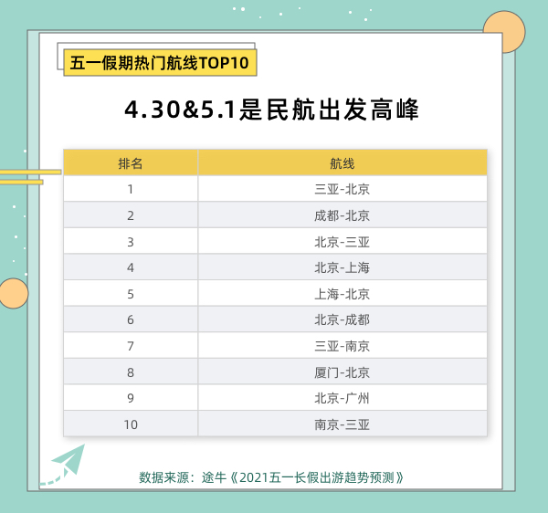 ????? 根據(jù)途牛發(fā)布的《2021五一長假出游趨勢預(yù)測》數(shù)據(jù),在旅游快速復(fù)蘇、“加長版”假期、旅游優(yōu)惠活動(dòng)等多重利好下,今年“五一”計(jì)劃出游的人數(shù)將暴增。出行人數(shù)的激增使多條熱門航線票價(jià)大漲,4月30日和5月1日兩天是民航出發(fā)最高峰,而返程高峰將出現(xiàn)在5月4日、5日的假期末尾。