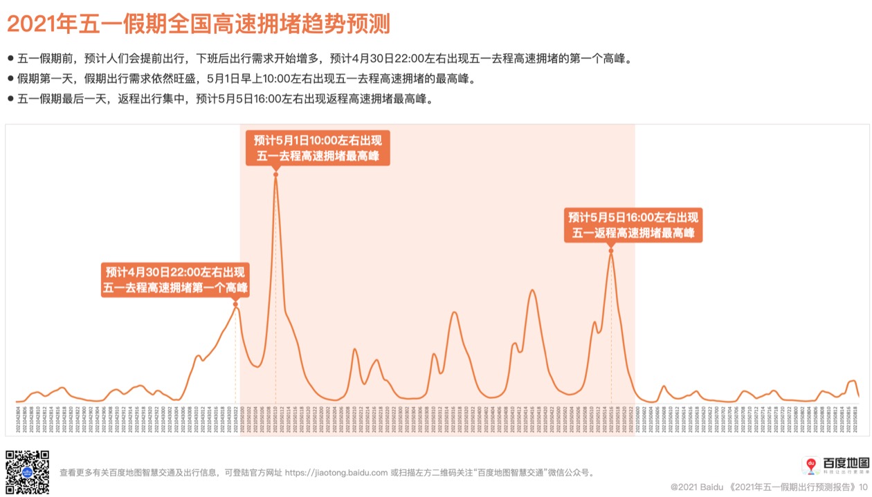 ????? 假期前,預(yù)計(jì)人們會(huì)提前出行,下班后出行需求開始增多,預(yù)計(jì)4月30日22:00左右出現(xiàn)五一去程高速擁堵的第一個(gè)高峰。
