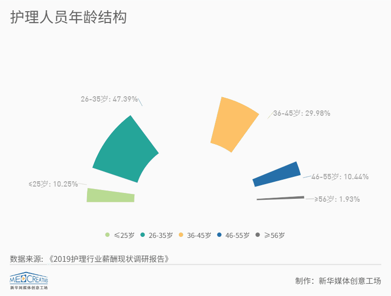 護士這一群體中,年輕力量居多。根據(jù)《護理管理雜志》統(tǒng)計數(shù)據(jù)顯示,26-35歲的護理人員占比幅度最大為47.39%,接近護理群體的近五成,36-45歲年齡段的護理人員次之,26-45歲年齡段的護理群體是整個護理行業(yè)的中流砥柱。