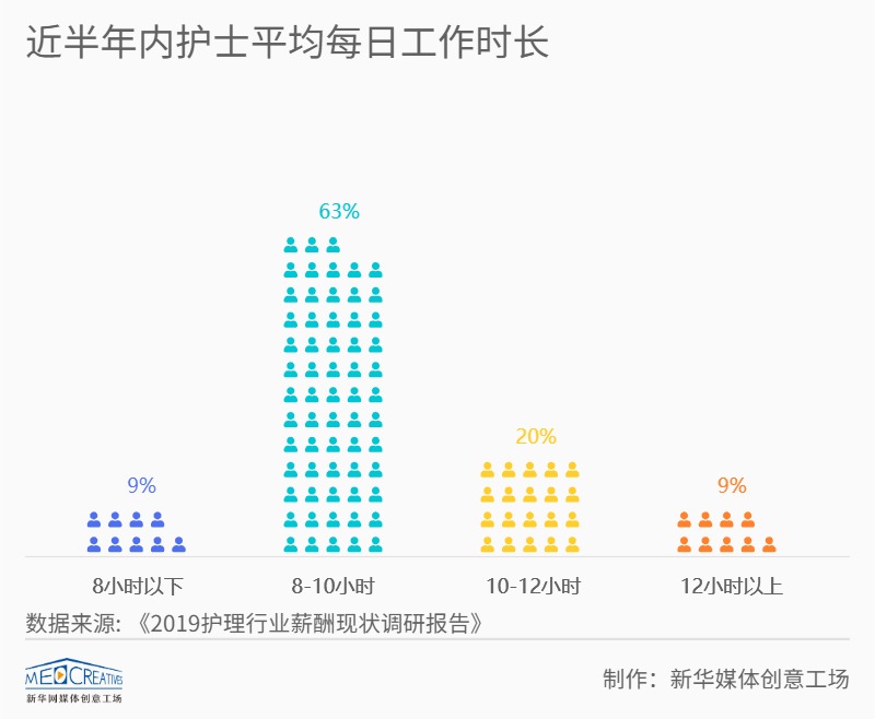 2019年8月,醫(yī)學(xué)界傳媒發(fā)布《2019護理行業(yè)薪酬現(xiàn)狀調(diào)研報告》,報告顯示91%的護士每日工作8小時以上,近三成護士每日工作超過10小時,其中超過12小時占比9%,大部分護士每日工作時間在8—10小時。