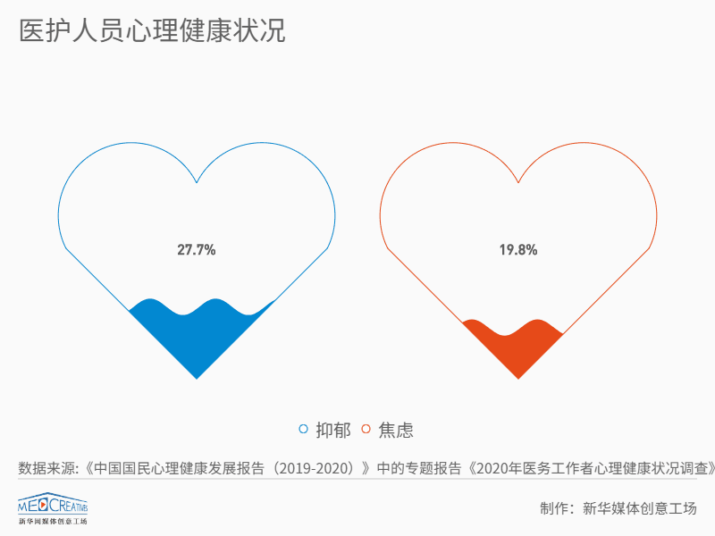 根據(jù)最新出版的心理健康藍皮書《中國國民心理健康發(fā)展報告(2019~2020)》中,對醫(yī)務(wù)人員進行了一期專題報告《2020年醫(yī)務(wù)工作者心理健康狀況調(diào)查》的數(shù)據(jù)顯示,27.7%的醫(yī)護工作者可能存在抑郁傾向,19.8%的醫(yī)護工作者有焦慮傾向。護士群體的焦慮水平僅次之醫(yī)生,護士抑郁高風(fēng)險比例為9%,30—45歲醫(yī)務(wù)工作者抑郁水平最高。