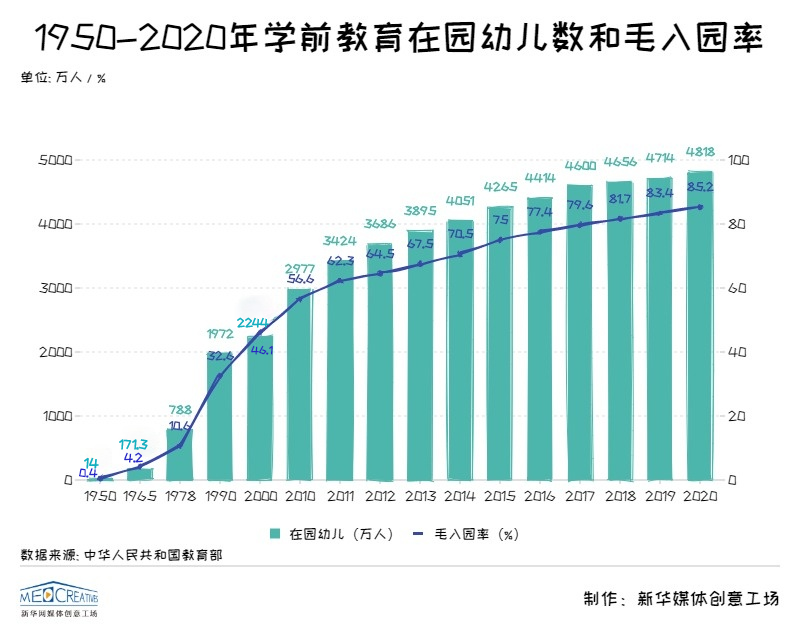 新中國成立以來,我國學(xué)前教育實(shí)現(xiàn)了快速發(fā)展。1950年我國學(xué)前教育在園兒童人數(shù)僅為14萬人,這個(gè)數(shù)字在2020年達(dá)到4818萬,學(xué)前教育毛入園率更是從1950年0.4%提高到2020年的85.2%。