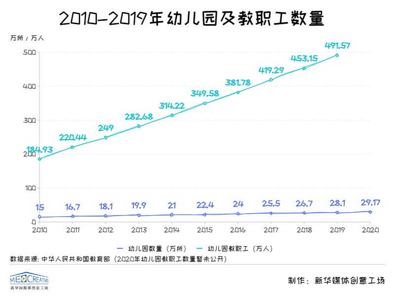 2020年,全國幼兒園總數(shù)達(dá)到29.17萬所,與2010年相比幾乎翻了一倍。于此同時(shí),我國幼兒教師也逐漸增多,學(xué)歷層次逐年提高。2019年我國幼兒園教職工491.57萬人,比上年增加38.42萬人,增長8.48%。根據(jù)教育部最新數(shù)據(jù)顯示,2019年全國306.68萬幼兒園園長和專任教師中,本科及以上學(xué)歷的比例為25.75%,專科學(xué)歷的比例為57.83%,合計(jì)為83.58%。