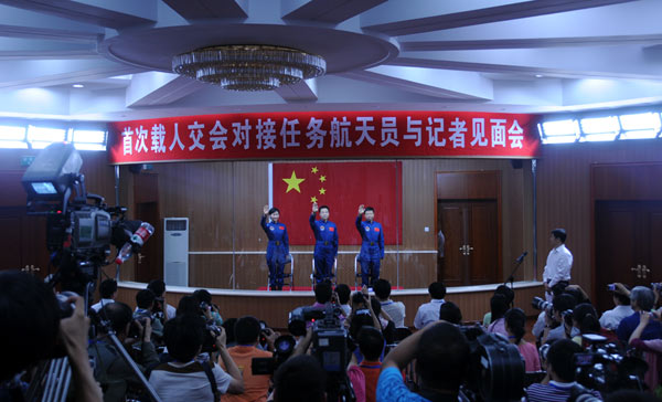 航天員景海鵬、劉旺、劉洋向大家致禮