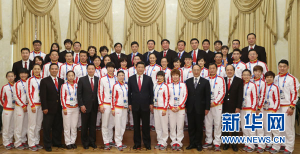 ??? 2月7日,中共中央總書記、國家主席、中央軍委主席習(xí)近平在俄羅斯索契親切看望參加第二十二屆冬季奧林匹克運(yùn)動(dòng)會(huì)的中國體育代表團(tuán)。這是習(xí)近平同代表團(tuán)成員集體合影。新華社記者 蘭紅光 攝