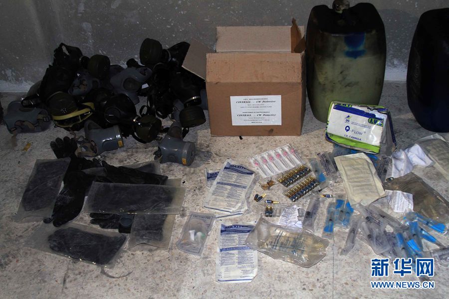 反對派武裝的地下軍火庫,存有防毒面具、裝有化學(xué)制劑的油桶和盛有針劑大小有毒液體的器皿。
