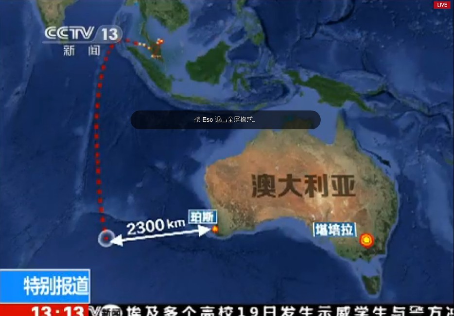 ??? 發(fā)現(xiàn)可疑碎片的位置與馬航失聯(lián)客機(jī)南部搜尋航道高度吻合