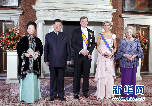 ??? 3月22日,國家主席習近平在阿姆斯特丹會見荷蘭國王威廉-亞歷山大。當晚,威廉-亞歷山大國王在王宮為習近平舉行盛大國宴。威廉-亞歷山大國王、馬克西瑪王后、貝婭特麗克絲前女王共同迎接習近平和夫人彭麗媛到來。新華社記者鞠鵬攝