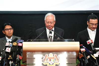 新聞發(fā)布會開始,一臉嚴肅的納吉布說,他當天傍晚得到英國空難調查處代表的通報。根據(jù)后者的通知,先前提供衛(wèi)星數(shù)據(jù)以指出南北兩條搜救走廊的國際海事衛(wèi)星組織已經(jīng)根據(jù)數(shù)據(jù)實施了進一步的計算。
