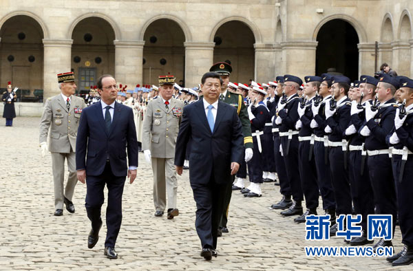 ??? 據(jù)新華社“新國際”微博3月27日報道,法國總統(tǒng)奧朗德26日下午在巴黎榮軍院廣場舉行盛大儀式,歡迎中國國家主席習(xí)近平。打破常規(guī)在榮軍院舉行歡迎儀式,奧朗德總統(tǒng)一路陪同,146名騎兵左右護衛(wèi) ......隆重的禮儀,盡顯東道主的熱情和尊重。