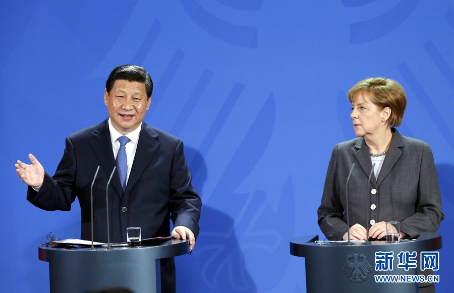 3月28日,國家主席習近平在柏林與德國總理默克爾共同會見記者。 新華社記者 鞠鵬 攝
