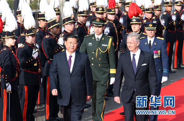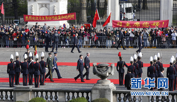 ????3月30日,中國國家主席習(xí)近平在布魯塞爾會(huì)見比利時(shí)國王菲利普。會(huì)見前,習(xí)近平出席菲利普國王在王宮廣場舉行的隆重歡迎儀式。新華社記者 鞠鵬 攝