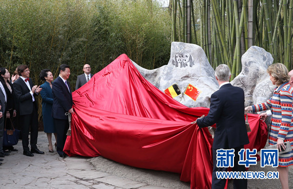 ????3月30日,國(guó)家主席習(xí)近平和比利時(shí)國(guó)王菲利普共同出席比利時(shí)天堂公園大熊貓園開(kāi)園儀式。這是習(xí)近平和夫人彭麗媛同菲利普國(guó)王夫婦共同為大熊貓園揭幕。 新華社記者 龐興雷 攝