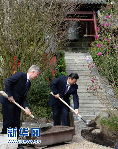 ????3月30日,國(guó)家主席習(xí)近平和比利時(shí)國(guó)王菲利普共同出席比利時(shí)天堂公園大熊貓園開(kāi)園儀式。這是習(xí)近平與菲利普國(guó)王共同為一棵象征友誼的玉蘭樹(shù)培上新土。 新華社記者 馬占成 攝