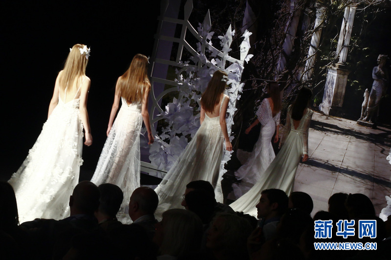 模特在T臺上展示西班牙品牌Yolan Cris的婚紗。Yolan Cris品牌由Yolanda和Cristina姐妹聯(lián)手打造,同時這也是來自巴塞羅那當(dāng)?shù)氐囊粋€婚紗品牌。