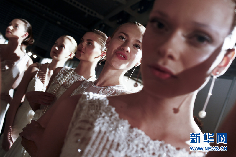 場(chǎng)外正在準(zhǔn)備登臺(tái)展示婚紗的模特。